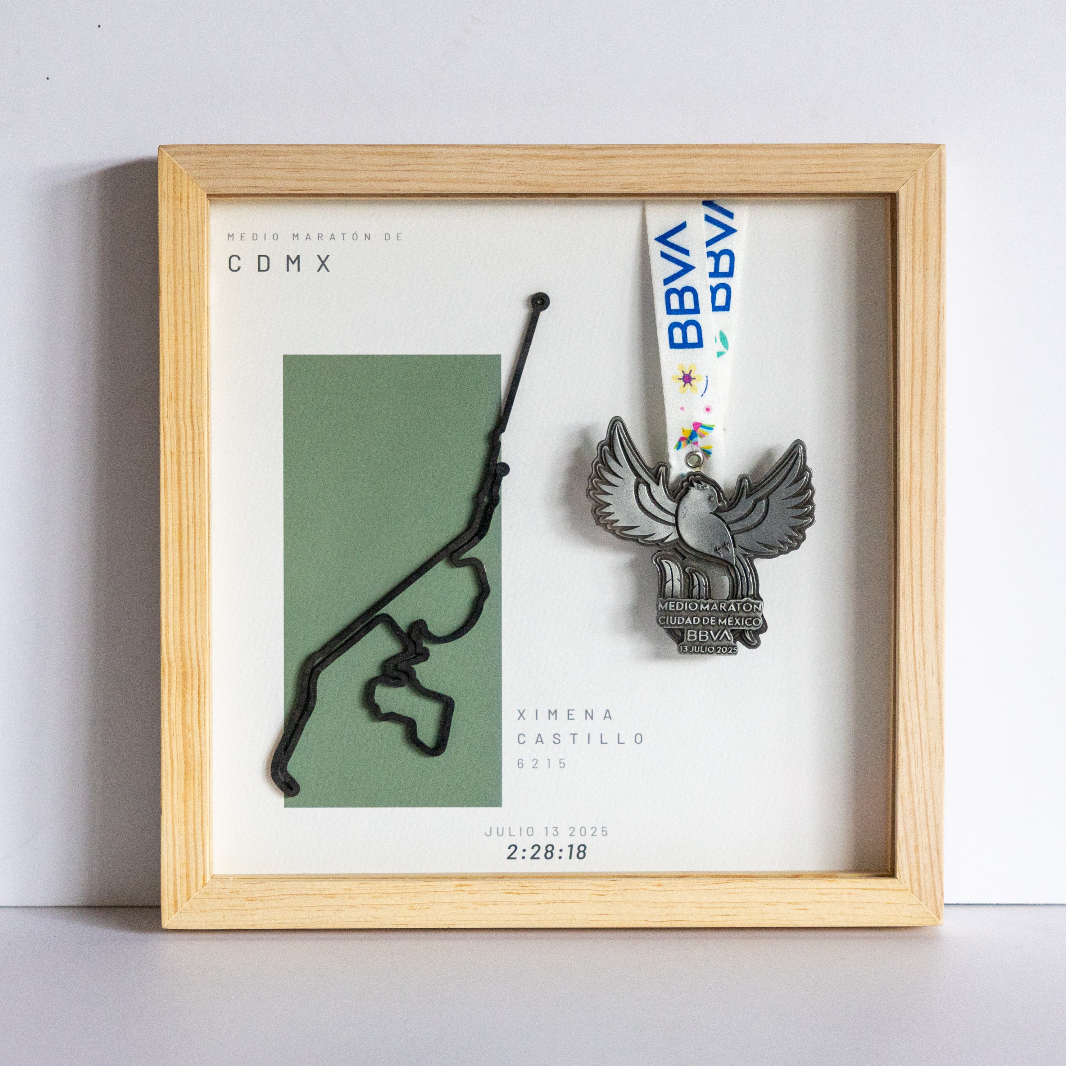 La impresión es en papel de algodón de 350gr y el circuito del medio maratón de Ciudad de México, es en madera reciclada y pintada, dando mayor profundidad y realce; el marco tiene un acabado natural por lo que estéticamente se adapta a cualquier espacio. Todas las piezas se entregan con vidrio para proteger tu Tamburello®.