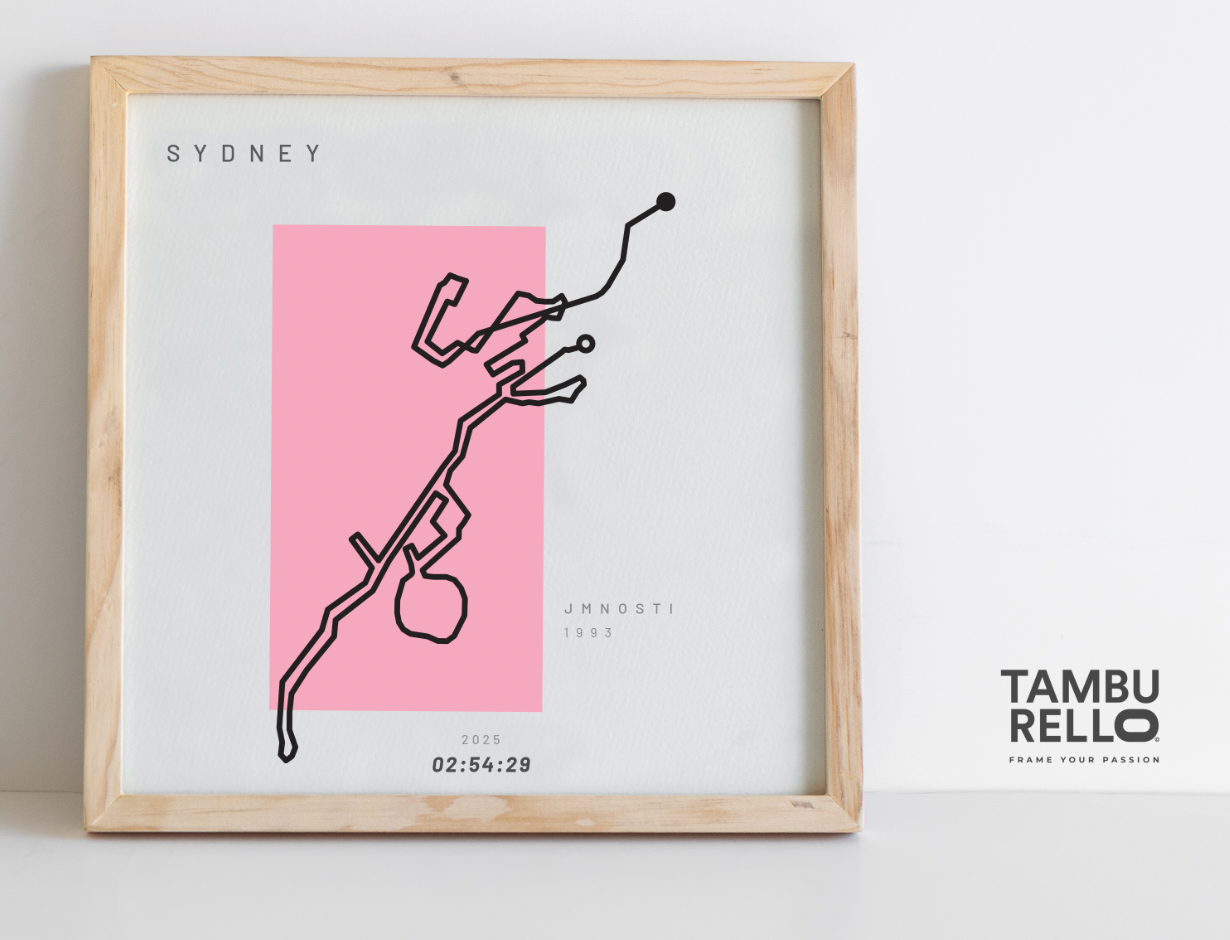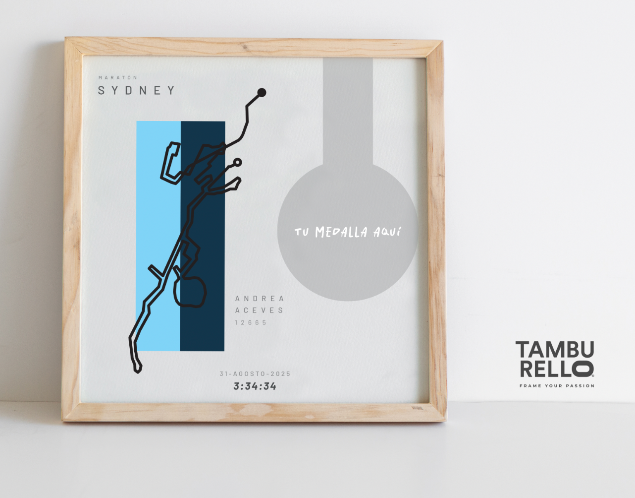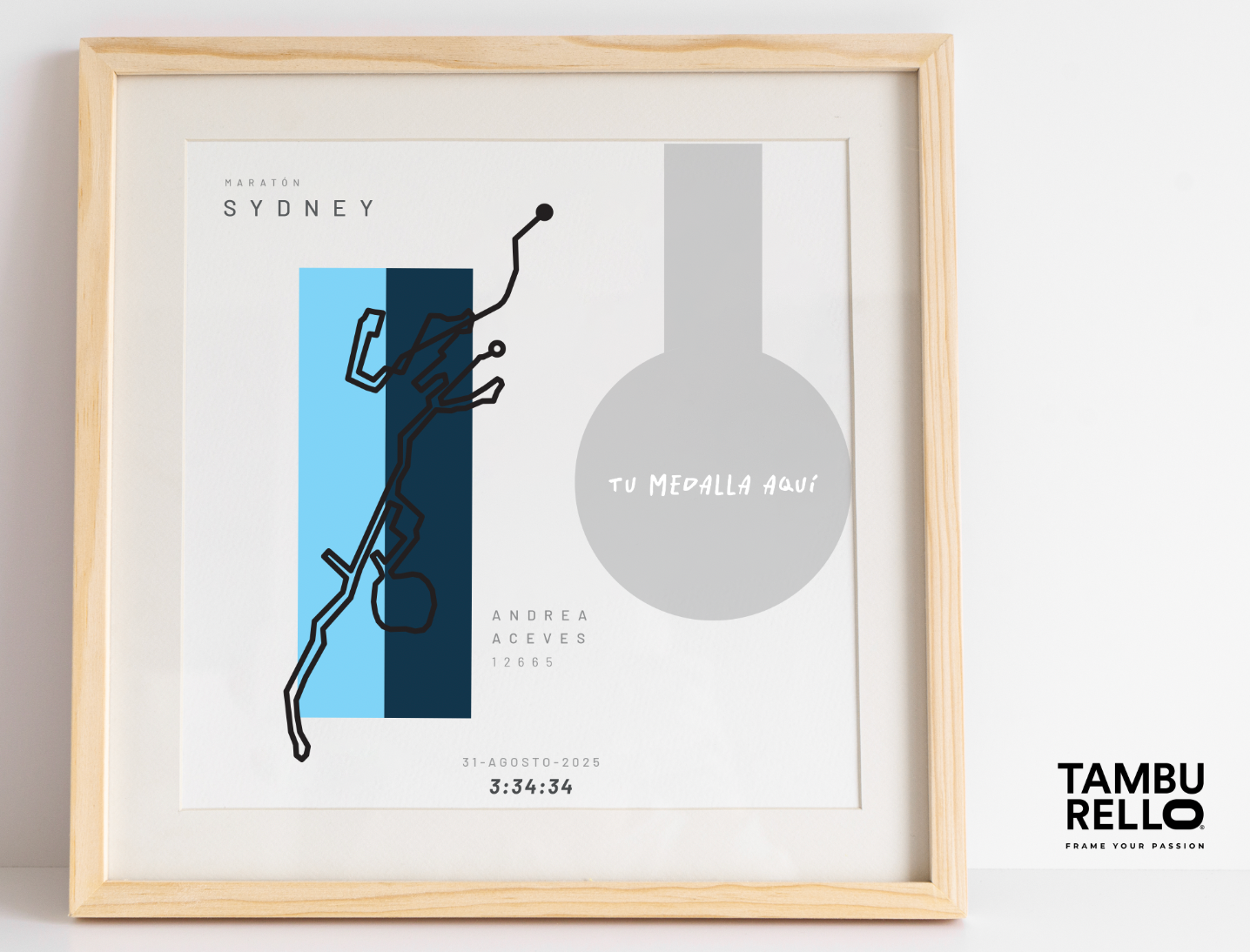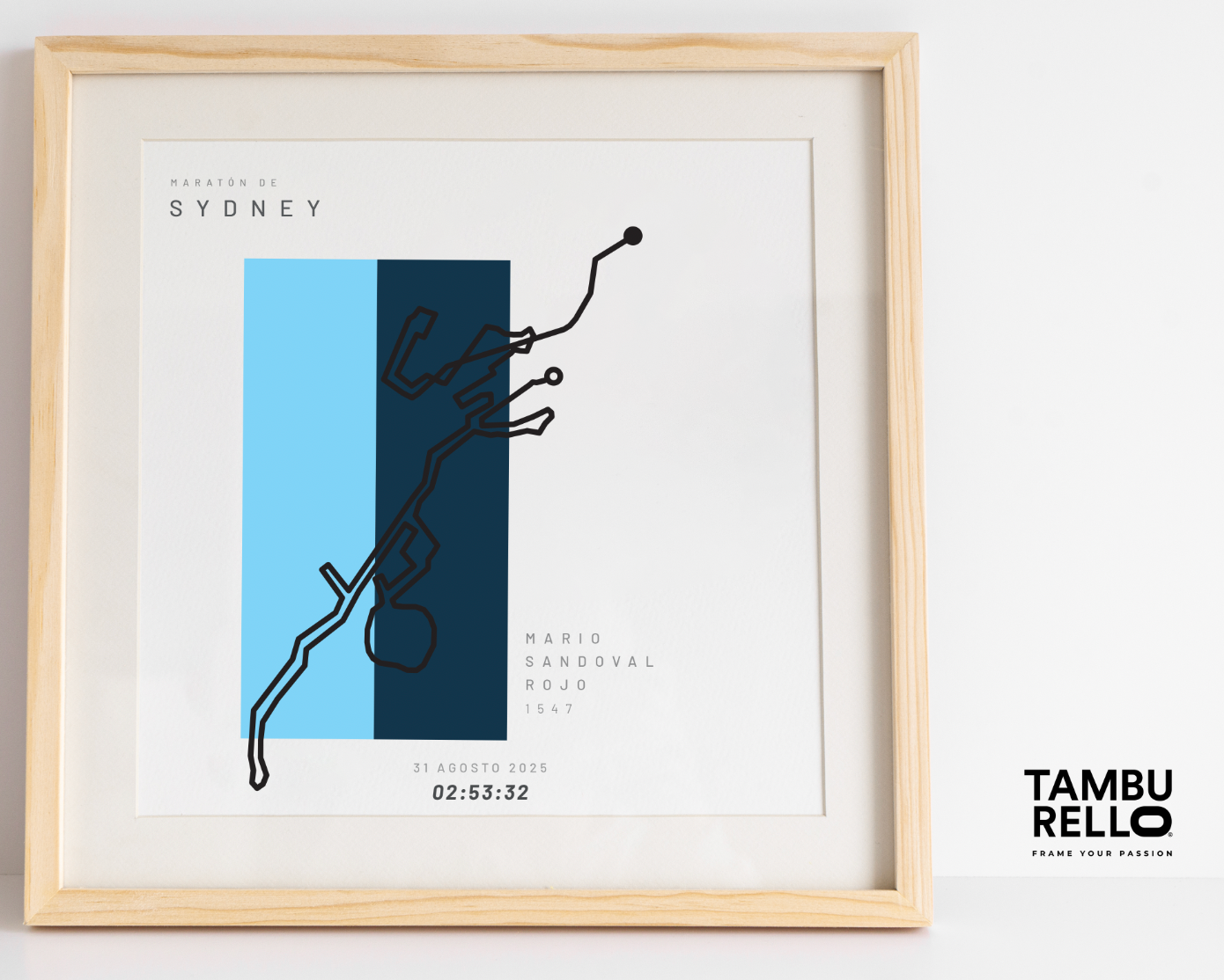 La impresión es en papel de algodón de 350gr y el circuito del Maratón de Sydney, es en madera reciclada y pintada, dando mayor profundidad y realce; el marco tiene un acabado natural por lo que estéticamente se adapta a cualquier espacio. Todas las piezas se entregan con vidrio para proteger tu Tamburello®.